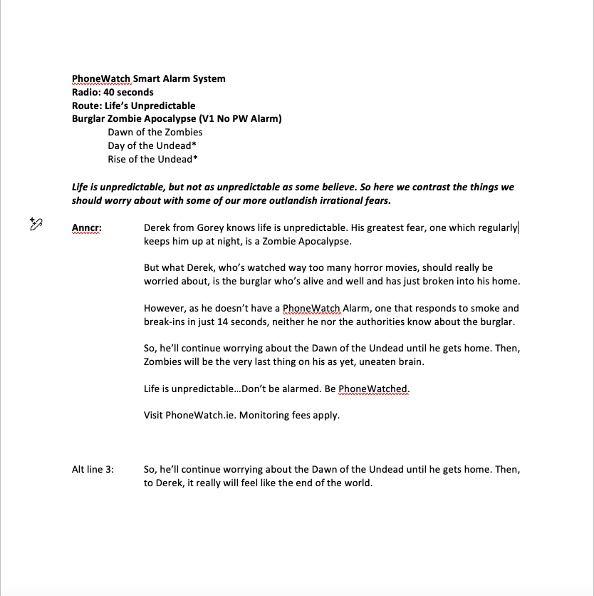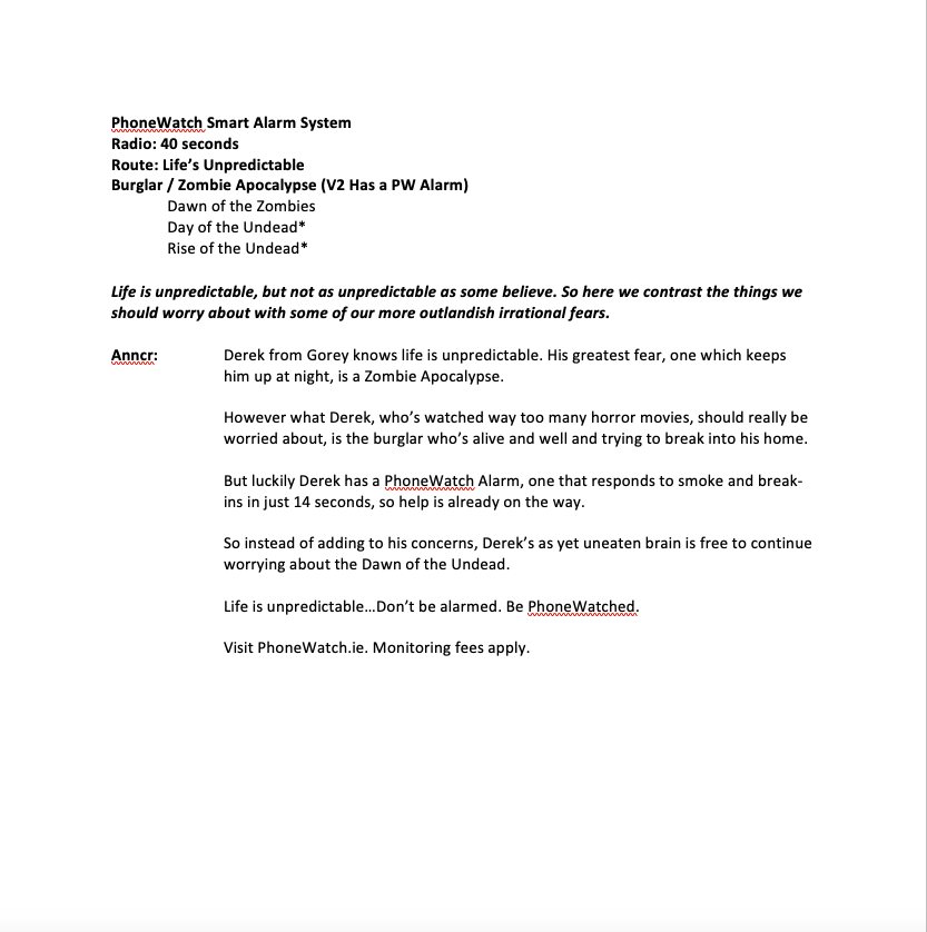 Facing increased competition, Phonewatch wanted to promote a new alarm system that protected against floods and fire as well as burglary. However, instead of focusing in on these granular details, with this campaign we alluded to the complete peace of mind it offers, by highlighting the only things it doesn’t protect against; irrational, absurd concerns like an alien invasion or a zombie apocalypse. While helping to deliver distinctive look and feel, the 1950s B-movie poster aesthetic also reinforced the comic tone. Sadly a concept that never made it off the drawing table.